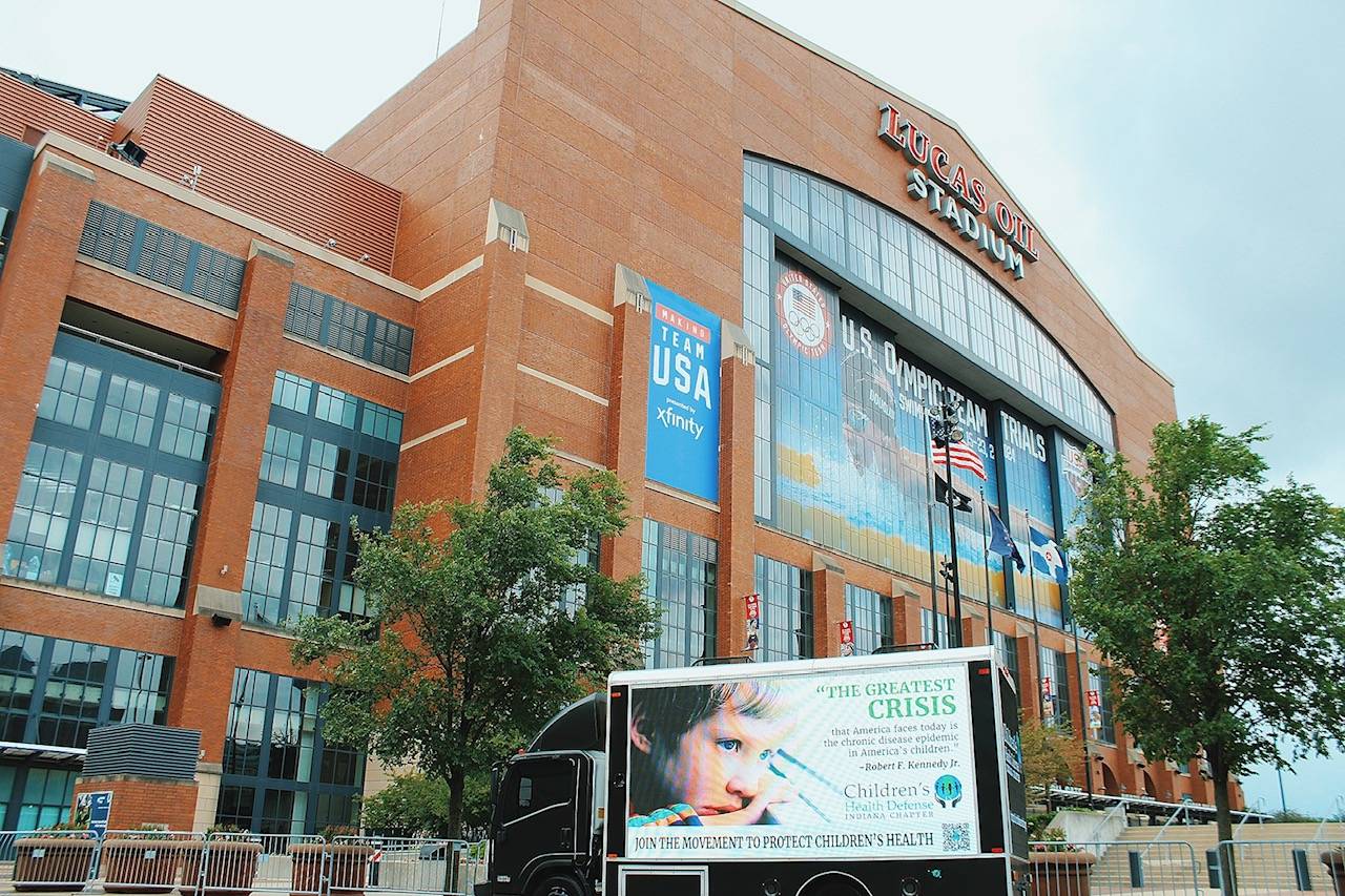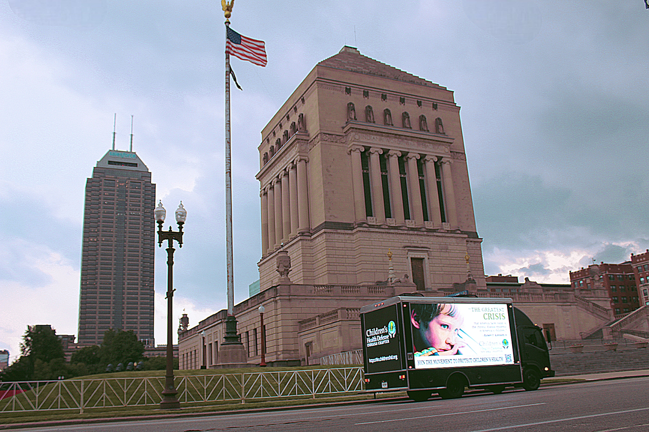 That’s why we decided to purchase a mobile billboard truck to cruise downtown Indianapolis during Memorial Day Weekend. If you were in the area of Gainbridge Fieldhouse, Lucas Oil Stadium and Circle Centre Mall on Friday, May 23, 2024 between 4:30 p.m. and 8:30 p.m.,  you might have seen our truck! The graphic on the sides of the truck included a QR code linking to our home page so people can read all about our organization. The next time you are in a social situation and anything regarding children’s health epidemics comes up in the conversation – be sure to talk about the amazing work that Children’s Health Defense is doing!
